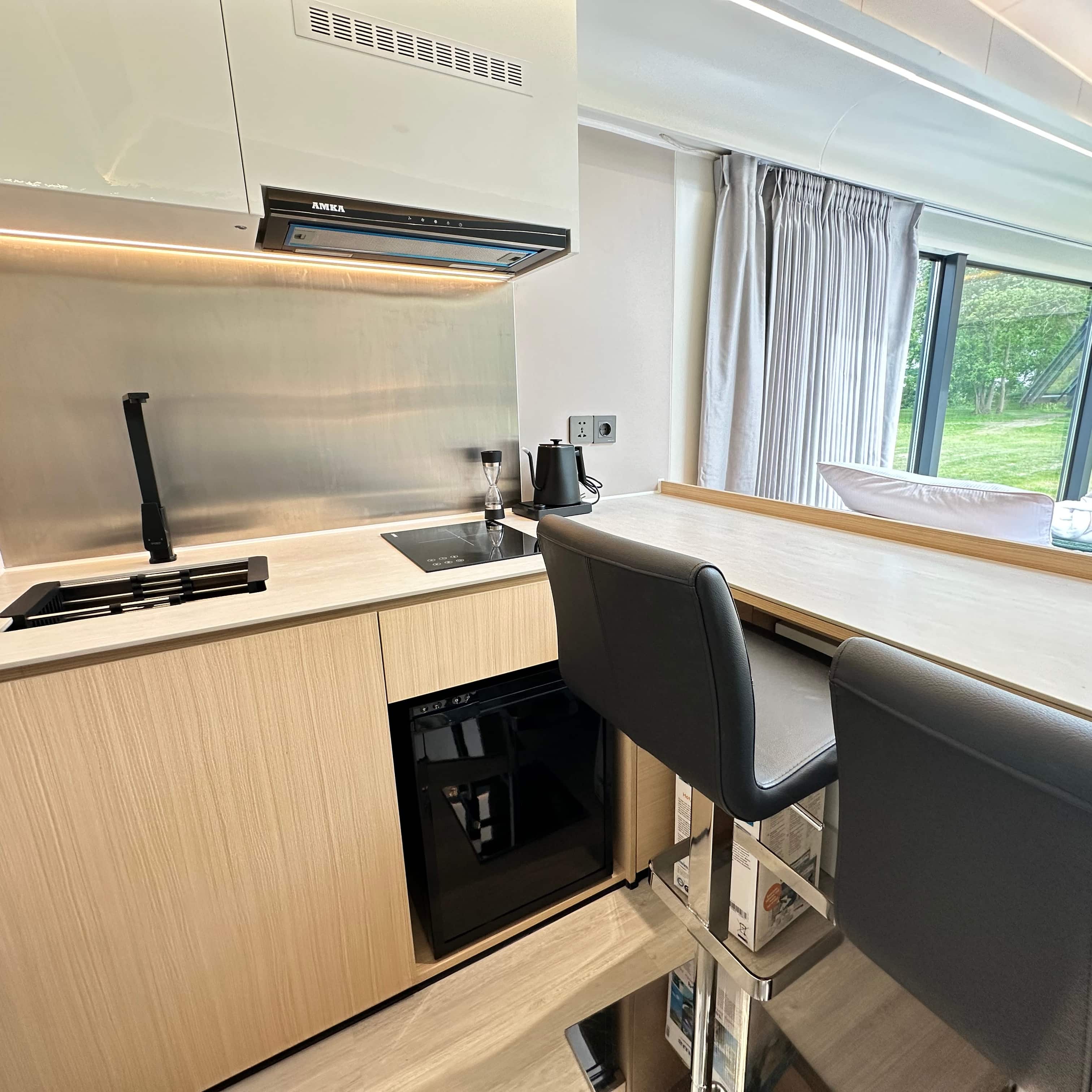 Dwuosobowy domek H5 oferuje 32 metry kwadratowe przestrzeni mieszkalnej, podzielonej na pokój dzienny połączony z sypialnią oraz łazienkę z prysznicem.