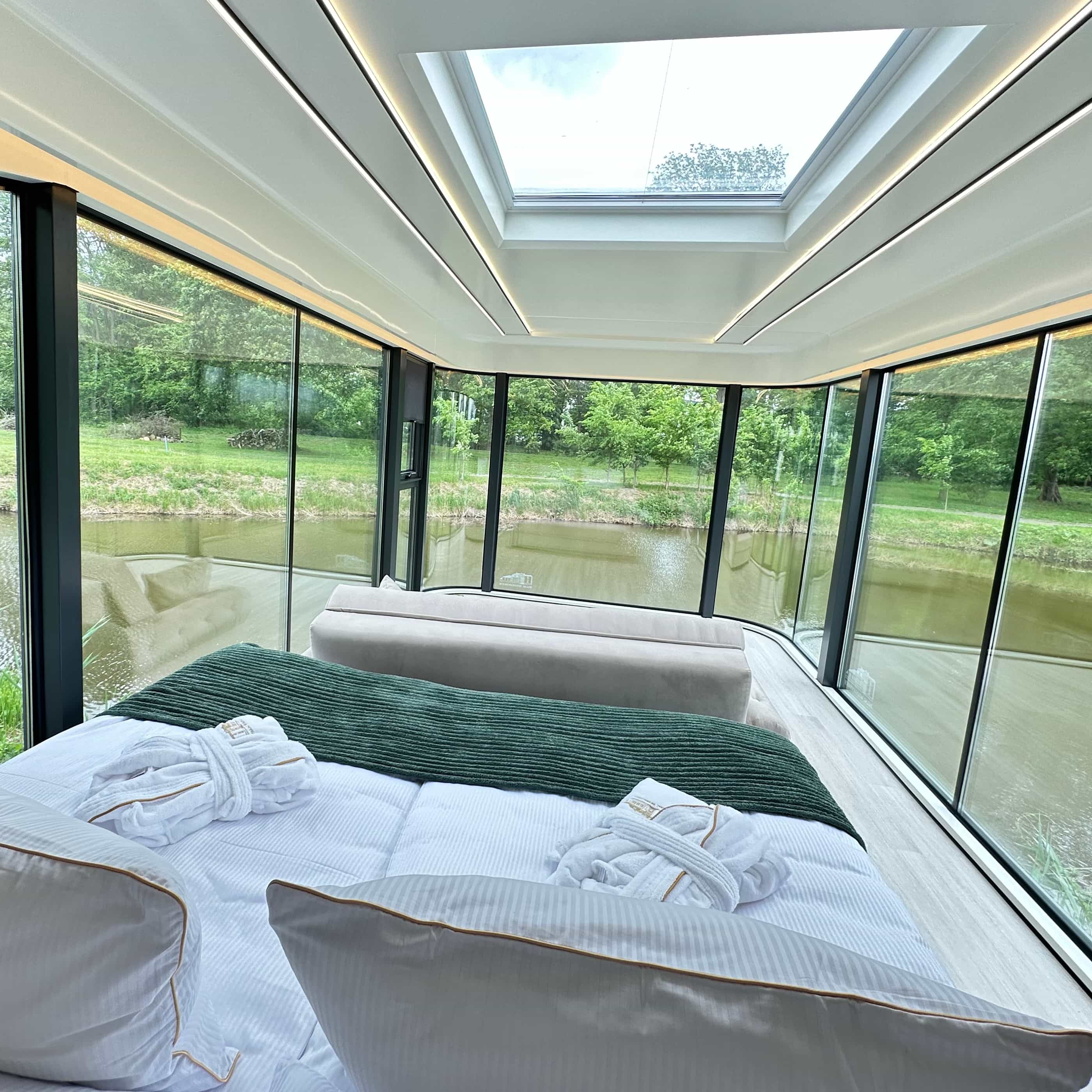 Przez ogromne okno naprzeciwko łóżka widać jedynie jezioro i drzewa, co czyni to miejsce idealnym do odcięcia się od zgiełku codzienności.
