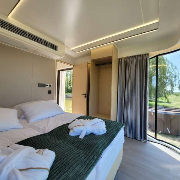 Przez ogromne okno naprzeciwko łóżka widać jedynie jezioro i drzewa, co czyni to miejsce idealnym do odcięcia się od zgiełku codzienności.