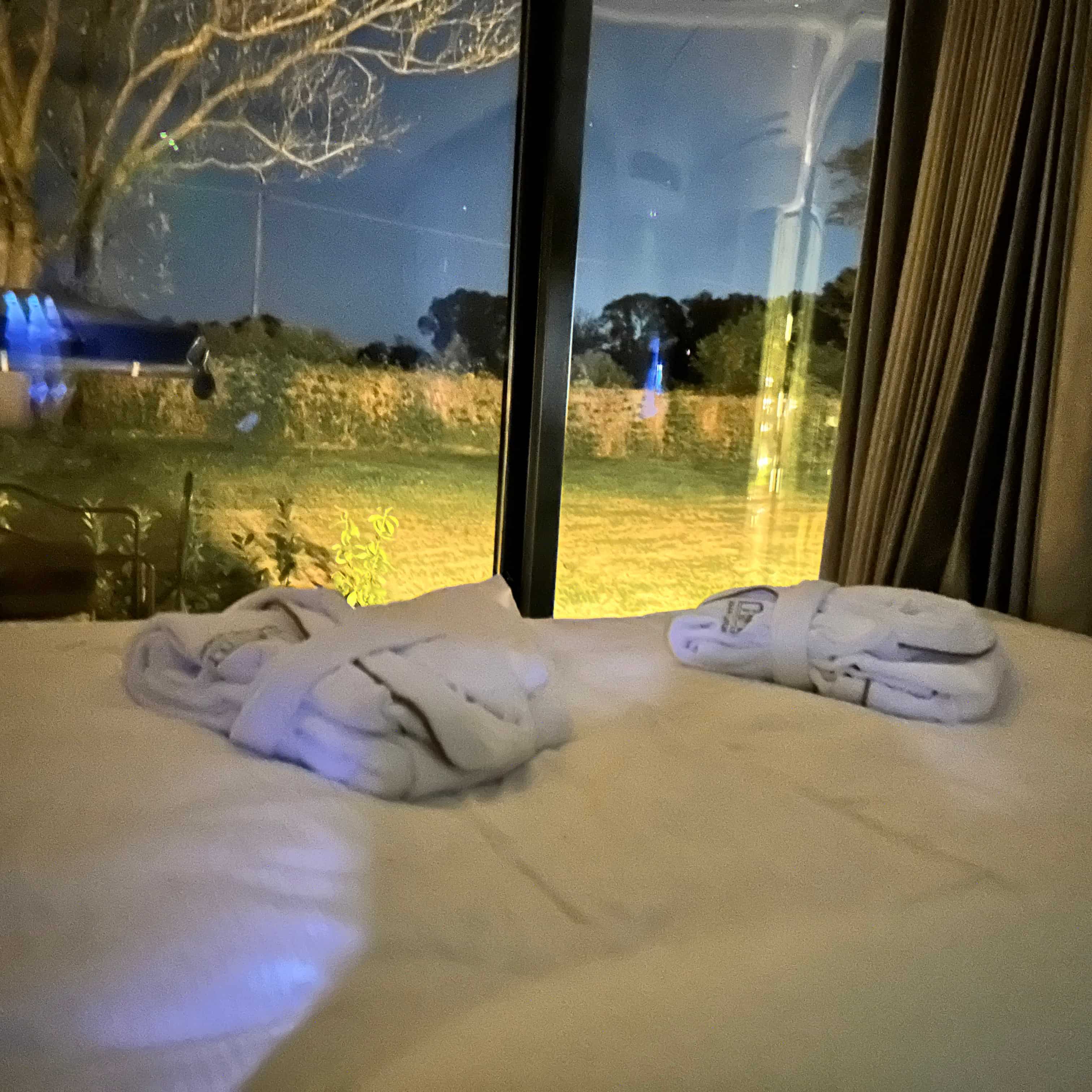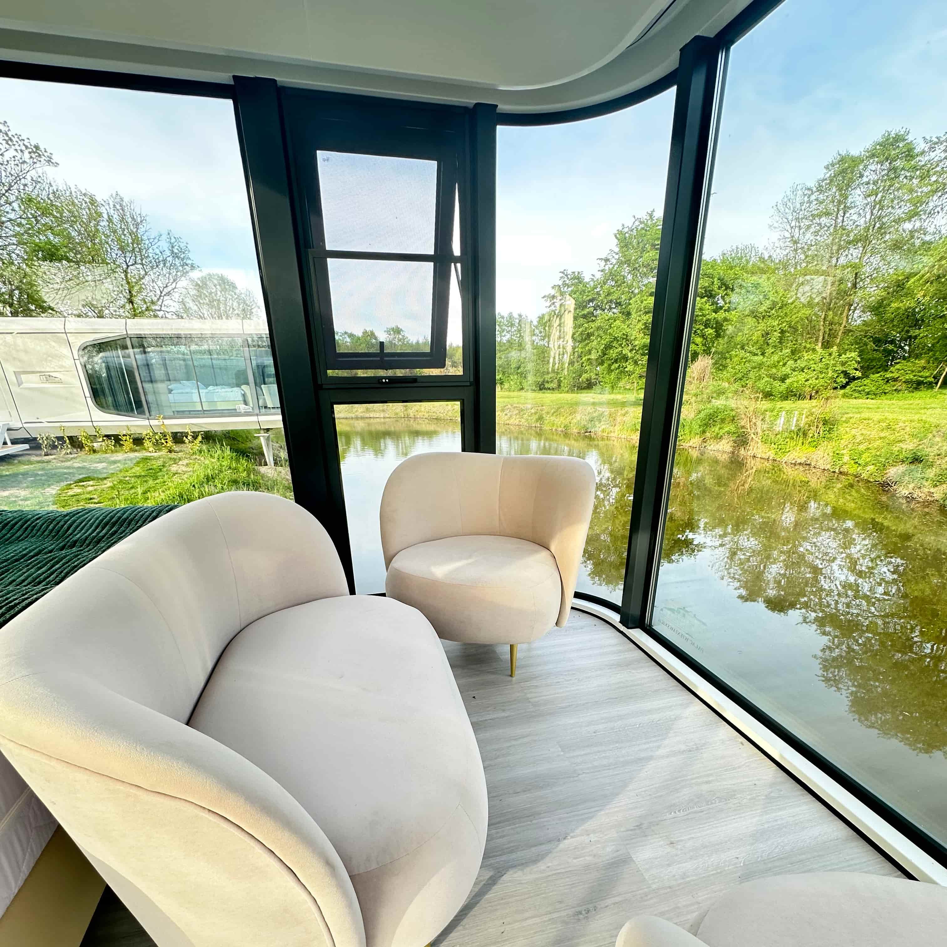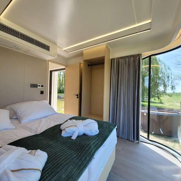 Przez ogromne okno naprzeciwko łóżka widać jedynie jezioro i drzewa, co czyni to miejsce idealnym do odcięcia się od zgiełku codzienności.