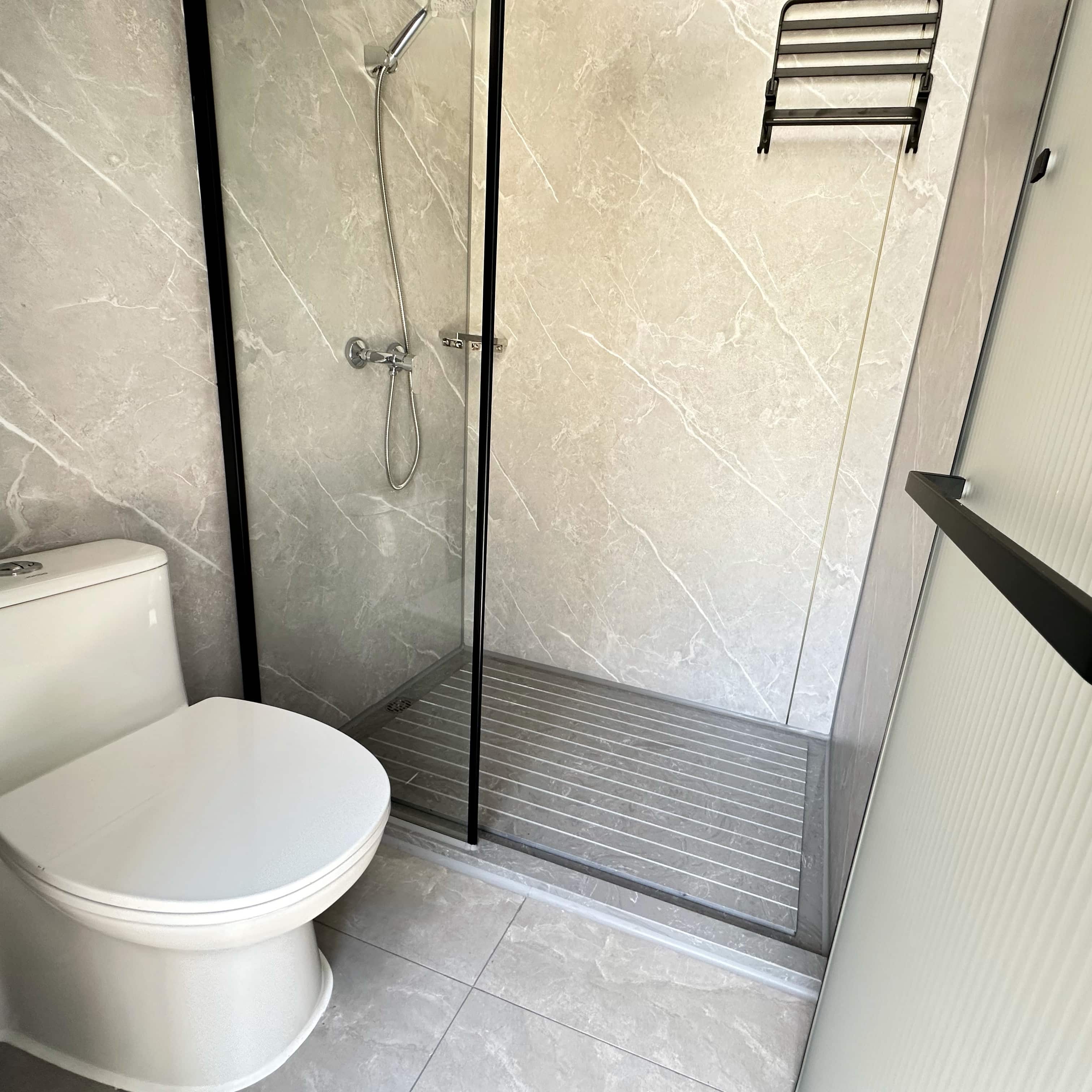 Dwuosobowy domek A3 oferuje 15,7 metra kwadratowego przestrzeni mieszkalnej, podzielonej na pokój dzienny połączony z sypialnią oraz łazienkę z prysznicem.